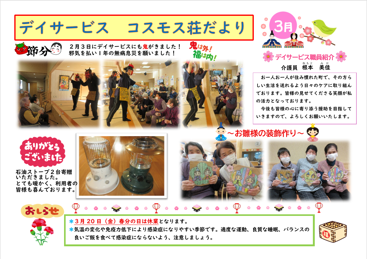 14:00 ラジオ体操、レクリエーション、ゲーム、脳トレ、カレンダー作成、壁面装飾等